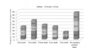 توزیع تجربه پوسیدگی دندان با فراوانی درگیری دندان های قدامی ماکسیلا در شکل 2 آمده است. بیش از 28 نفر از کودکان متأثر همگی دندان های قدامی ماکسیلار درگیر داشتند، 5/20 درصد دو دندان پوسیده، 5/15 درصد سه دندان پوسیده و 7/13 درصد یک یا چهار دندان و 1/8 درصد دندان پنج پوسیده داشتند. میزان داشتن چهار دندان پوسیده در دختران نسبت به پسرها بیشتر بود، با این حال تفاوت معناداری در تعداد دندان های پوسیده برحسب جنسیت مشاهده نشد.