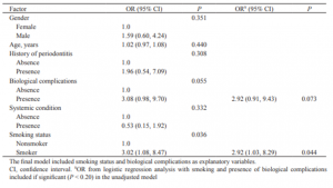 عوارض بیولوژیکی در 11 بیمار غیرسیگاری و 13 بیمار سیگاری (در مجموع 24 بیمار) ثبت شد. در طول اولین سال پیگیری، 6 بیمار (4 بیمار با 4 ایمپلنت که سیگاری بودند و 2 بیمار غیرسیگاری با 3 ایمپلنت) دچار عفونت ایمپلنت شدند (با افزایش عمق پاکت پریودنتال به بیش از 4 میلی‌متر و ترشح چرک) که تمام این عفونت‌ها از طریق درمان‌های غیرجراحی (شامل مقیاس‌گذاری ایمپلنت و تزریق آنتی‌بیوتیک‌ها) رفع شدند؛ به جز یک ایمپلنت (در بیماری که سیگاری بود) که وضعیت خودش را تا زمان حذف پس از 33 ماه پیگیری حفظ کرد. 18 بیمار دیگر (9 بیمار با 11 ایمپلنت که سیگاری بودند و 9 بیمار غیرسیگاری با 7 ایمپلنت) آسیب اطراف ایمپلنت را نشان دادند (با افزایش عمق پاکت پریودنتال به بیش از 4 میلی‌متر، MBR و از بین رفتن سطح اتصال همزمان)؛ تمام آسیب‌ها بعد از سال اول پیگیری رخ می‌دهد.