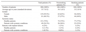 در این مطالعه، 200 بیمار (119 زن و 81 مرد) با محدوده‌ی سنی 23-80 سال (میانگین= 53.7 سال) شرکت کرده بودند. وضعیت بیماران به مدت 5 سال زیر نظر گرفته شد. بیماران بر اساس وضعیت سیگار کشیدن خود به دو گروه مجزا تقسیم شدند: بیماران سیگاری (تعداد= 100 بیمار) و غیر سیگاری (تعداد= 100 بیمار). 49 بیمار مبتلا به بیماری‌های سیستمیک وجود داشت (افراد سیگاری: 23 بیمار با 92 ایمپلنت؛ افراد غیرسیگاری: 26 بیمار با 104 ایمپلنت؛ جدول 1).