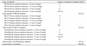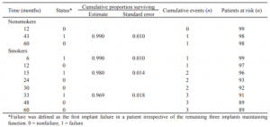 در مجموع 800 ایمپلنت با سطح اکسید شده (سیستم Branemark؛ NobelSpeedy, Nobel Biocare) نصب شده بود: 282 ایمپلنت Mklll (174 ایمپلنت در بیماران غیر سیگاری، و 108 ایمپلنت در بیماران سیگاری)، 221 ایمپلنت MkIV (125 ایمپلنت در بیماران غیرسیگاری و 96 ایمپلنت در بیماران سیگاری) و 296 ایمپلنت NobelSpeedy (101 ایمپلنت در بیماران غیرسیگاری و 196 ایمپلنت در افراد سیگاری، جدول 2).
