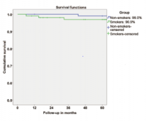 علیرغم میزان بالاتر شکست ایمپلنت که در این مطالعه برای افراد سیگاری در مقایسه با افراد غیرسیگاری ثبت شد؛ تفاوت بین منحنی‌های بقا برای هر دو گروه معنی‌دار نبود. مطالعات اندکی، اثر عادت سیگار کشیدن را بر میزان بازده این روش (با 5 سال پیگیری یا بیشتر) در بیمارانی که تحت بارگذاری فوری ایمپلنت قرار گرفته بودند؛ بررسی کردند. نتایج متناقضی از منابع موجود در مورد اثر عادت سیگار کشیدن بر روی بقا‌ ایمپلنت‌های دندانی بدست می‌آید. مطالعه‌ی متا آنالیز قبلی که افزایش دو برابری خطر شکست ایمپلنت را برای افراد سیگاری ثبت کرده بود؛ نشان می‌دهد (به دلیل شواهد محدود) که سیگار کشیدن تاثیرات منفی بر روی بهبود و نتیجه‌ی درمان ایمپلنت دارد و انجام بررسی‌های دوره‌ای به روز از تحقیقات بالینی موجود را پیشنهاد می‌کند. یکی دیگر از بررسی‌های سیستمیک اخیر و متا آنالیز، موفقیت ایمپلنت‌های دندانی را در افراد سیگاری و غیرسیگاری بررسی کرد و با وجود افزایش احتمال ثبت‌شده‌ی شکست ایمپلنت در افراد سیگاری (OR = 1.96)، یک آنالیز زیرگروهی شامل طول زمان پیگیری، نتوانست میزان شکست ایمپلنت را با افزایش زمان پیگیری مرتبط کند. این بدان معنی است که عوامل دیگری به غیر از عادت سیگار کشیدن ممکن است بر موفقیت نتیجه‌ی توانبخشی با ساپورت ایمپلنت در دراز مدت تاثیر بگذارند. مطالعه‌ی گذشته‌نگر قبلی، اثر عادت سیگار کشیدن را در دو گروه جداگانه از بیمارانی با ایمپلنت‌هایی با سطح منحصرا صاف یا ایمپلنت‌های سطح اکسید شده بررسی نمود و افزایش قابل‌توجه شکست ایمپلنت (نسبت خطر[21] برای افراد سیگاری= 3.1) را در گروه ایمپلنت‌های سطح صاف ثبت کرد؛ اما هیچ تاثیر قابل‌توجهی در گروه ایمپلنت‌های سطح اکسید شده وجود نداشت.