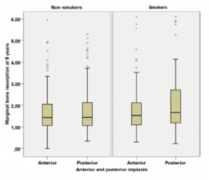 MBR میانگین (انحراف معیار استاندارد) پس از 5 سال پیگیری برای ایمپلنت قدامی و خلفی به ترتیب 1.66 میلی‌متر (0.94 میلی‌متر) و 1.71 میلی‌متر (0.78 میلی‌متر) و برای بیماران غیرسیگاری 1.71 میلی‌متر (0.78 میلی‌متر) و برای بیماران سیگاری 1.85 میلی‌متر (1.28 میلی‌متر) و 2.11 میلی‌متر (1.37 میلی‌متر) بود (شکل 8).